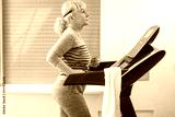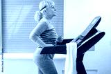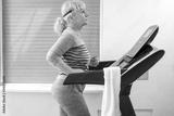 Active senior woman in sportswear using treadmill at home. Coronavirus Covid19 social distance. Home workout, active seniors, stay at home concept.