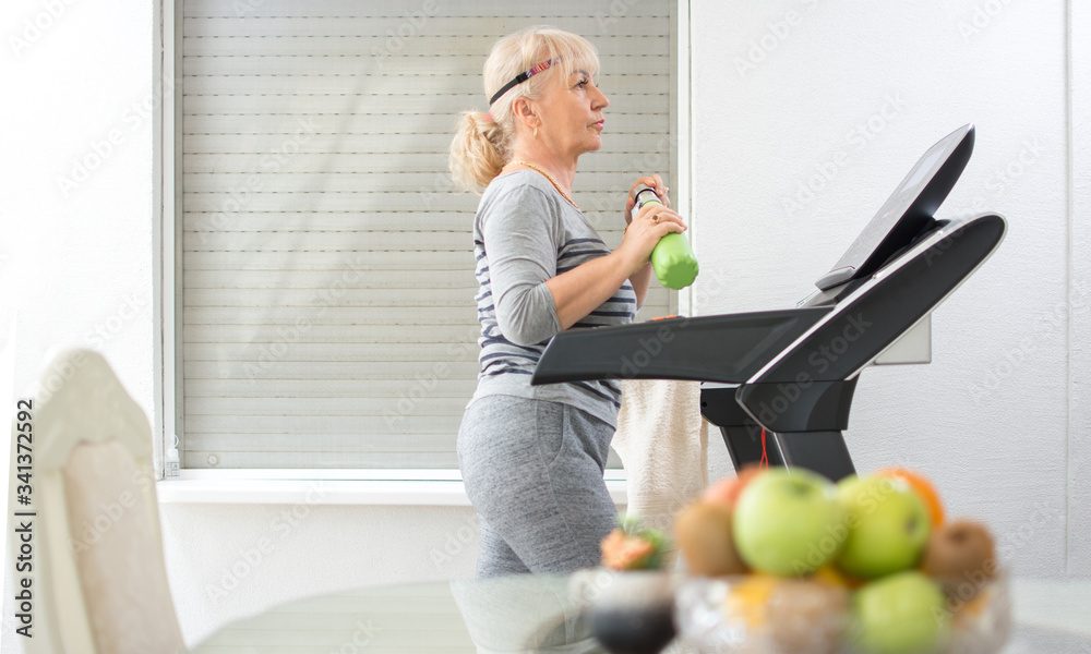 Active senior woman in sportswear walking on treadmill at home.