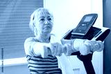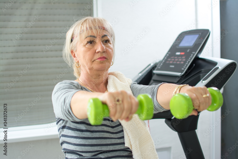 Senior exercising with weights at home. Corona virus, Covid-19, stay at home, active seniors, home quarantine concept.