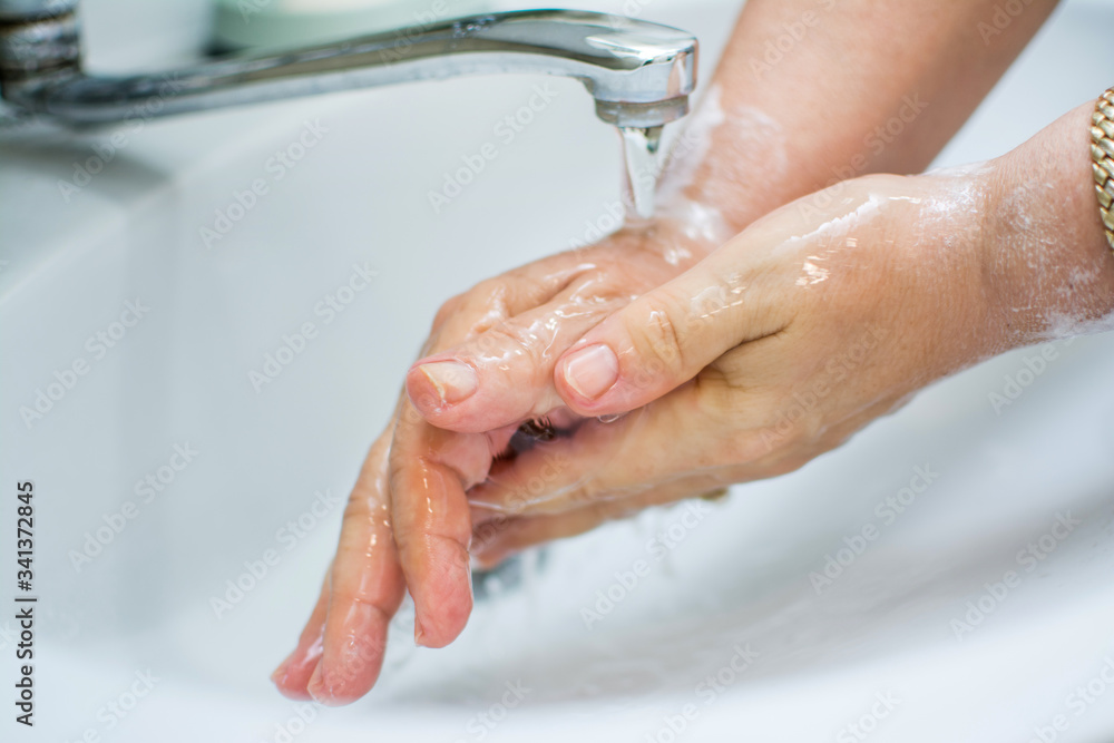Woman washing hands with soap under the faucet with water. Washing hands for daily personal care against Coronavirus pandemic.