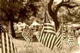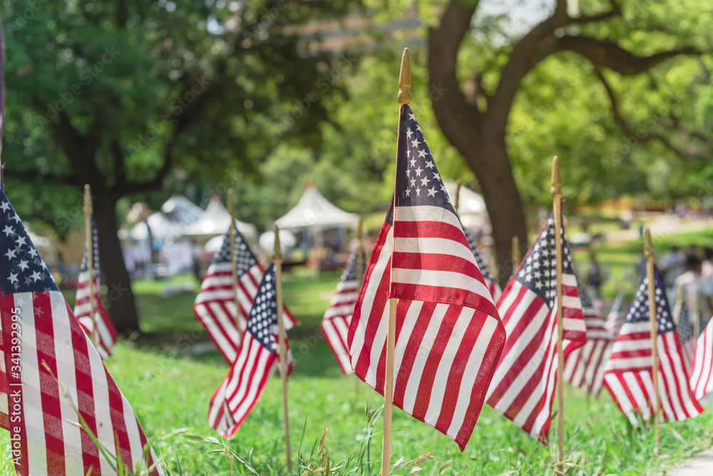 American flags display on green grass lawn under matured trees on Memorial Day in Dallas, Texas