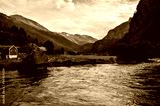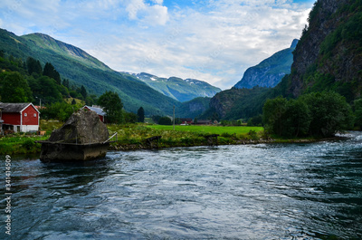 Scenic landscape with Flamselvi river surrounded by mountains and Flam valley with traditional norwegian, scandinavian houses