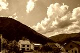 View on Carpathian village Kolochava, Houses and coniferous foreston hills on background. Beautiful summer landscape, cloudy sky at bright sunny day. Travel background.
