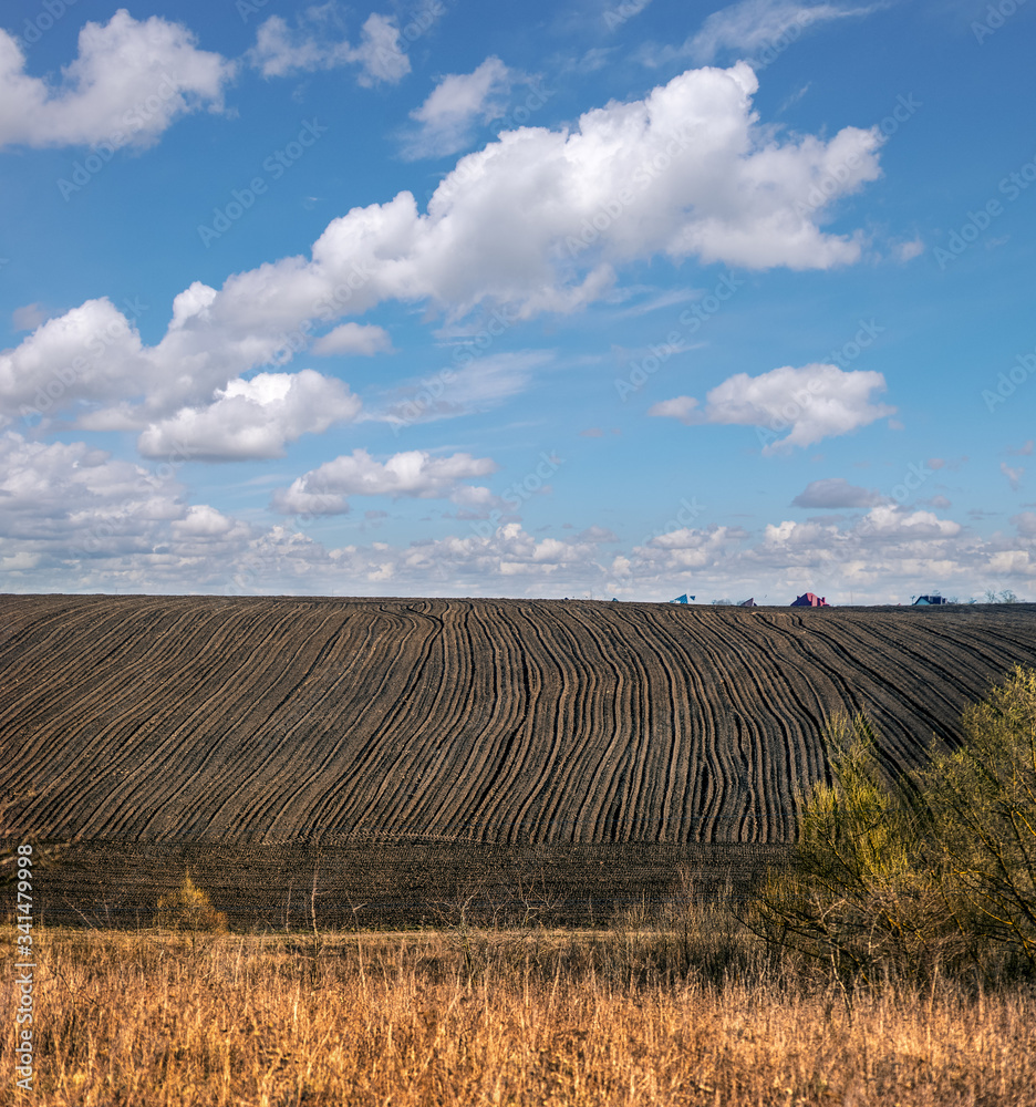 View of agricultural land prepared for sowing, arable soil. The ground after plowed and harrowed. Farmland landscape in the countryside of Ukraine