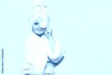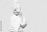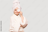 Smiling beautiful kid girl with towel on head hold cotton pad disk cleansing face skin with cleanser. Happy girl remove makeup enjoy healthy clean skincare beauty treatment concept