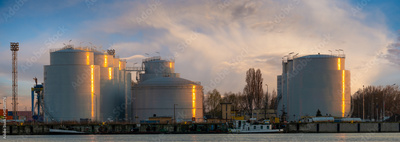 fuel tanks in the fuel warehouse in the light of the setting sun against the backdrop of storm clouds