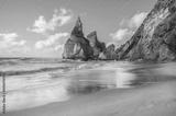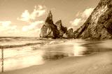 beautiful Atlantic ocean view horizon with sandy beach, rocks and waves at sunrise. . Sintra, Portugal