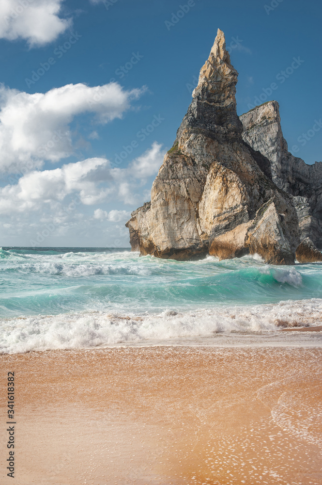 beautiful Atlantic ocean view horizon with sandy beach, rocks and waves at sunrise. . Sintra, Portugal