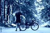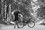 Confident strong man wearing black shorts, t-shirt and protective helmet standing on paved road among green trees near his professional black bike. Concept of sport and active lifestyle.
