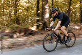 Motion blur of bearded cyclist wearing sport clothing, black helmet and mirrored glasses training with bike on asphalt road. Strong man improving skills and getting ready for competition