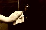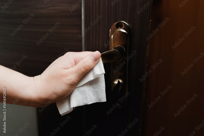 closeup female hands with a wet towel wipe the handle of a dark brown door from viruses