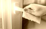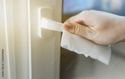 closeup female hands with a wet towel wipe the handle of a white door from viruses