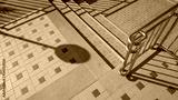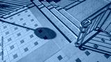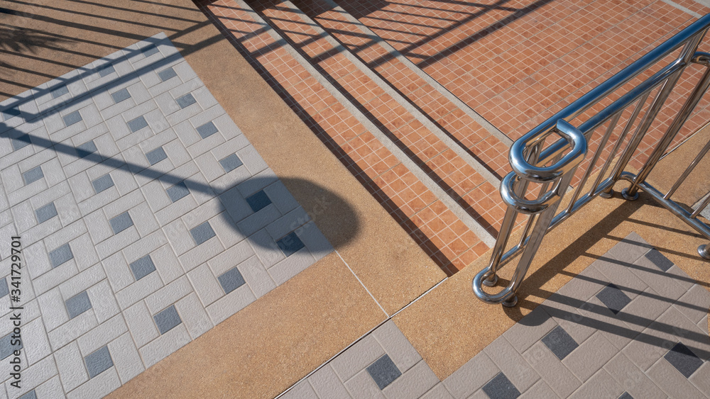 Sunlight and shadow on tile floor pattern surface of small staircase on different levels with stainless steel railing in exterior architecture concept, high angle view with copy space