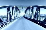 Metal bridge background. Road bridge construction. Empty asphalt road. Blue sky weather long bridge over Narew river. Tykocin village in Poland.