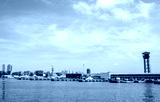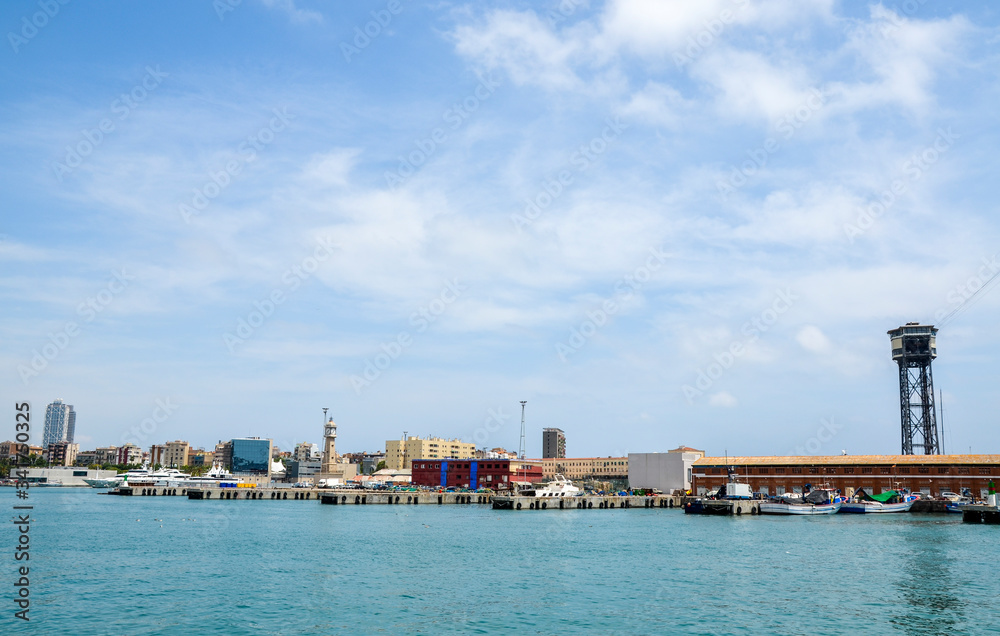 Port Vell and tower of Cable car from Mount Montjuic to the seaport. Aerial Tramway in Barcelona. Spain.