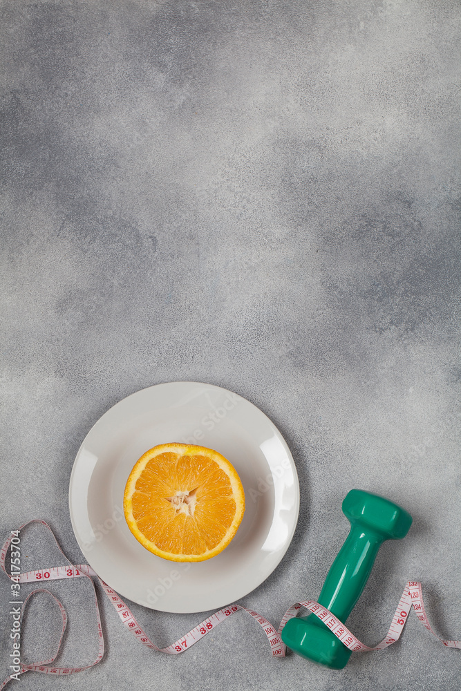 green dumbbell with measurement and plate with cut orange on blue background