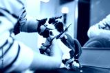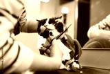 Veterinarian is shearing a cat with scissors in a pet beauty salon. A female Barber shaves a black and white cat. Grooming animals