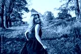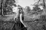 Candid dynamic lifestyle portrait of young attractive woman in long black dress outside. Beautiful woman is spining and having fun