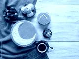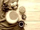 Festive food Ramadan background. Delicious homemade golden cake with a Crescent moon, served with black coffee and dates. Top view.