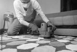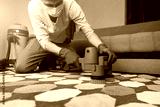 Dry cleaner's man employee removing dirt from carpet, vacuum clean with professional equipment.
