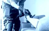 Man cleaning sofa chemical cleaning with professionally extraction method. Upholstered furniture. Early spring cleaning or regular clean up.
