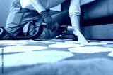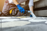 Male worker removing dirt from carpet with professional vacuum cleaner indoors