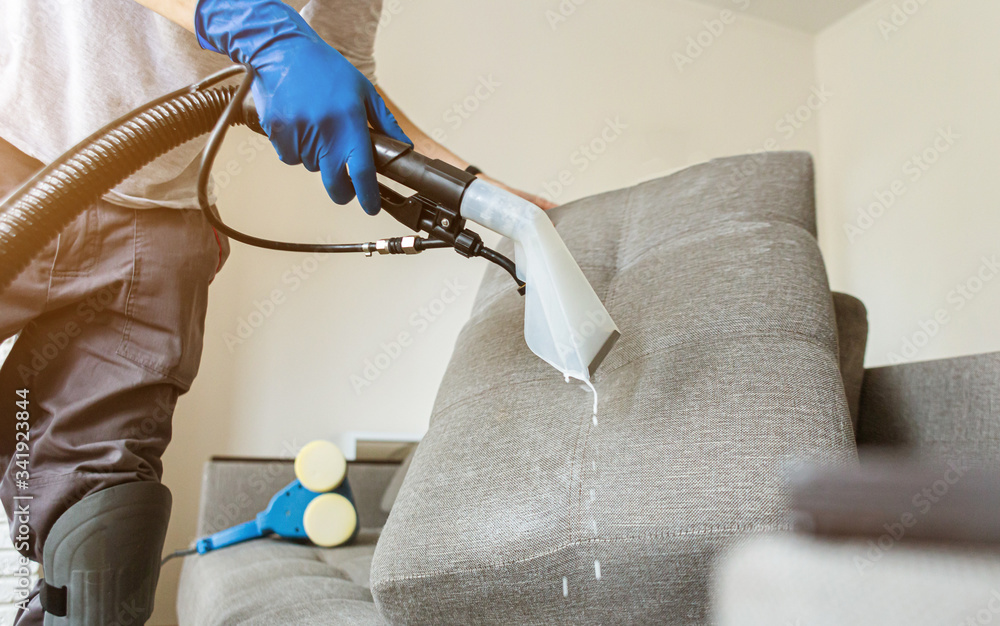 Man dry cleaner's employee hand in rubber glove cleaning sofa with professionally extraction method. Early spring regular cleanup. Commercial cleaning company concept.