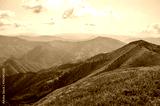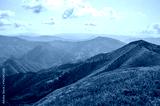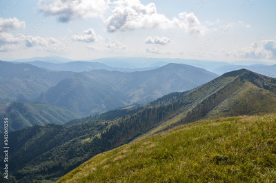 View from the top of Carpathian Mountains, grassy meadow of a hillside under the blue sky with clouds in summer day, Ukraine