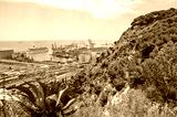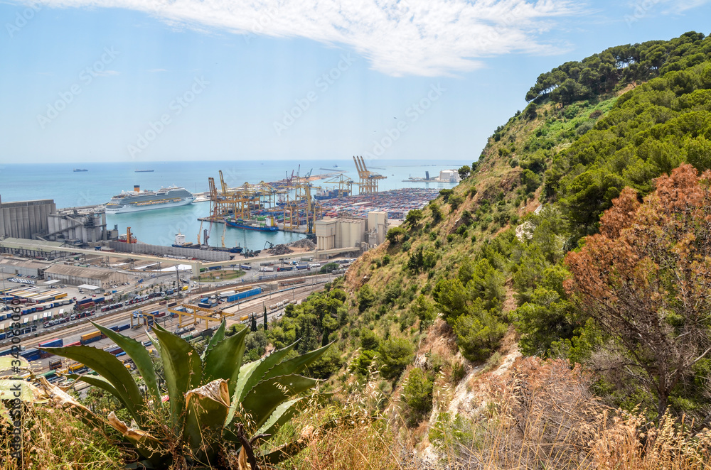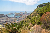 View of Barcelona cargo port at the Mediterranean Sea with cranes loading docks and and containers from the Montjuic mountain. Industrial port for freight transport and global business.