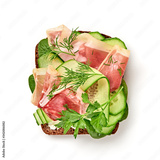 Open sandwich ham, cucumber, spinach. Homemade sandwich with rye bread, parsley isolated on white background, top view. Tasty smoked ham green sandwich closeup