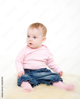 eight-monthly girl in a pink jacket and jeans
