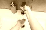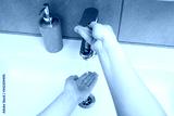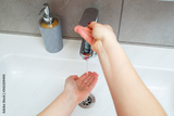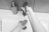 White sink with a silver faucet in the bathroom. Gray can with liquid soap for hands. Turning on the tap water, personal hand hygiene. Hand washing under running water