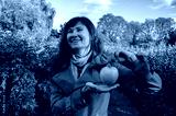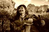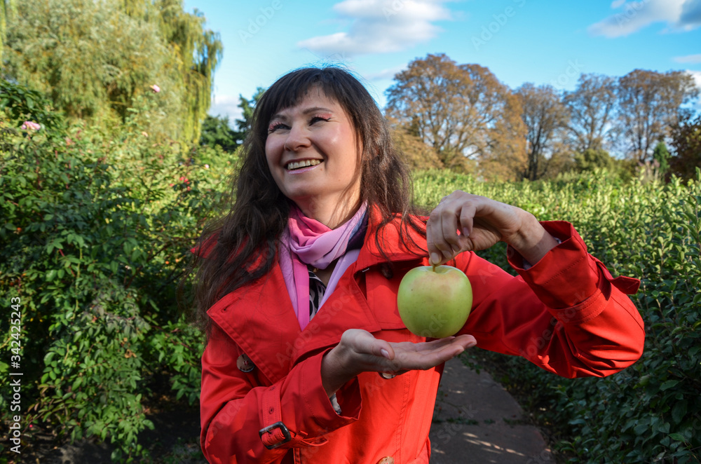 Beautiful smiling brunette girl in red coat holding fresh green apple on palm of her hand over nature background. Food, fruit and healthy nutrition