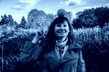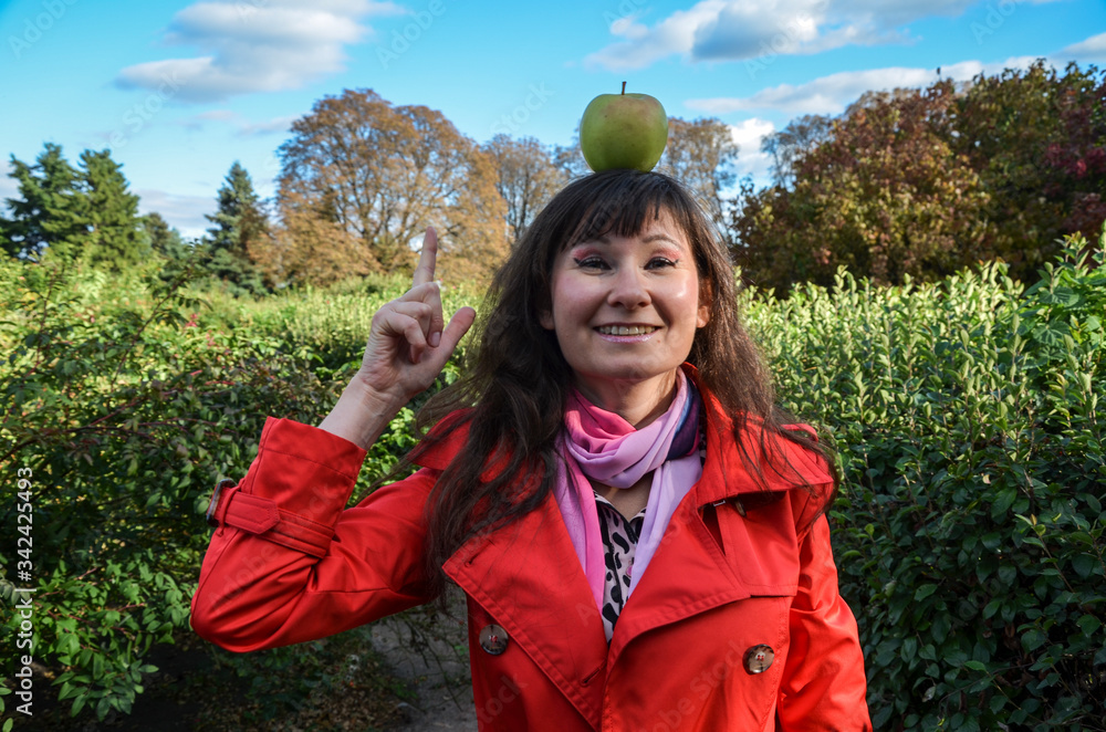 Funny сheerful young woman standing in park, smiling and looking into the camera, with green apple on her head. I`am having idea. Learning concept.