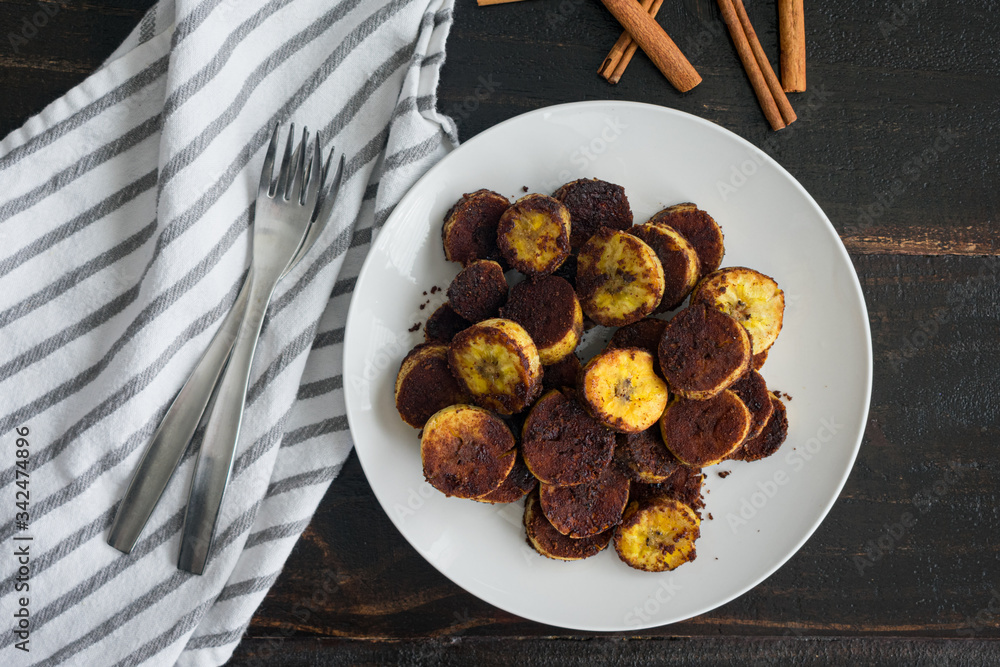 Caramel Cinnamon Baked Plantains: Baked plantain slices covered in cinnamon and palm sugar