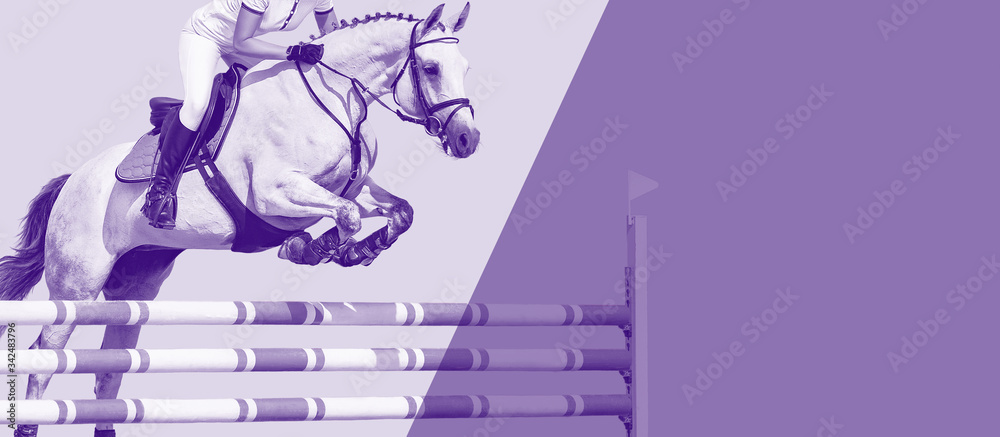 Horse and rider, black and white banner or header, billboard, duo tone. Beautiful white horse portrait during Equestrian sport show jumping competition, copy space for your text.