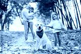 Happy beautiful family with dog labrador is having fun together walking the in park.
