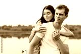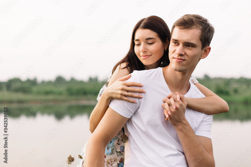 Young loving couple hugging near lake.