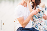Young loving couple hugging near lake on sunset.