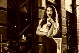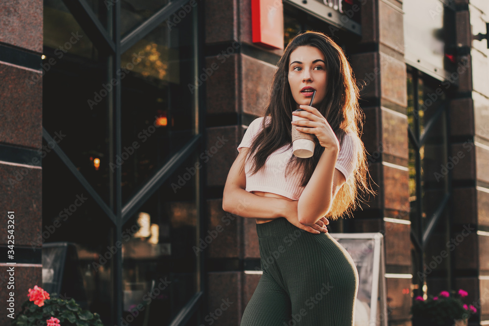 Beautiful smiling woman drink coffee walking on the city in summer day.