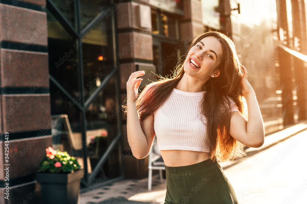 Beautiful smiling woman walking in the city on summer day.