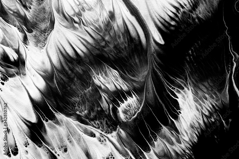 Abstract liquid black white colors paint blots background. Esoteric luid art, magic occultism, acrylic texture