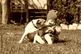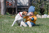 Small kid in yellow jacket with jack russel terrier puppy on spring backyard