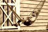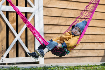 Small kid relaxing on pink hammock in spring garden. Happy childhood concept