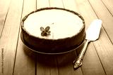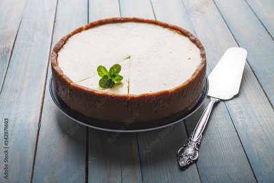Plane round classic New York cheesecake and his slice with sprig of mint on a plate on a wooden table. The concept of bakery and sweet cakes desserts