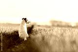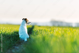 Jack russel terrier on green field on sunset time. Happy Dog with serious gaze