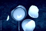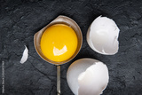Chicken yolk from broken organic egg in silver spoon on black concrete background. Food photography
