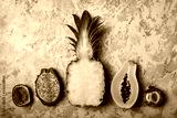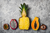 Pineapple, Papaya, Passion fruit Maracuya, Dragon fruit Pitaya and Mangosteen on grey concrete background. Exotic tropical fruits concept. Food photography