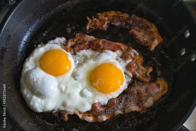 Breakfast with fried eggs and bacon closeup. Food phorography