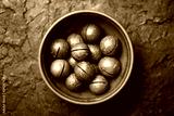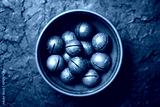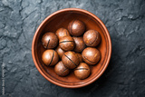 Dried organic Macadamia nuts in orange ceramic bowl closeup. Studio macro shoot. Black concrete background